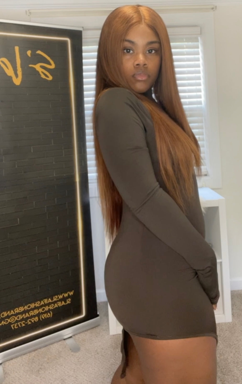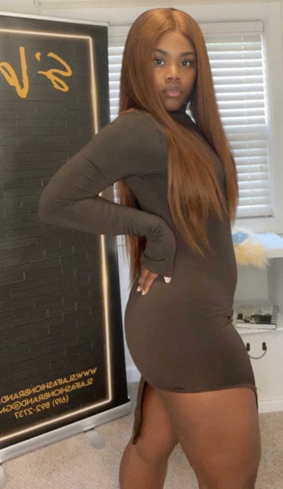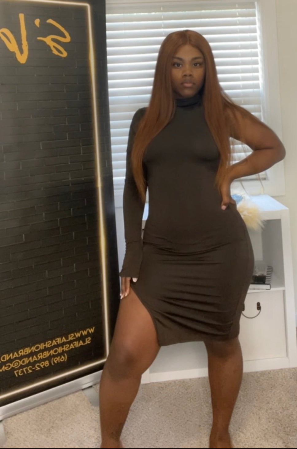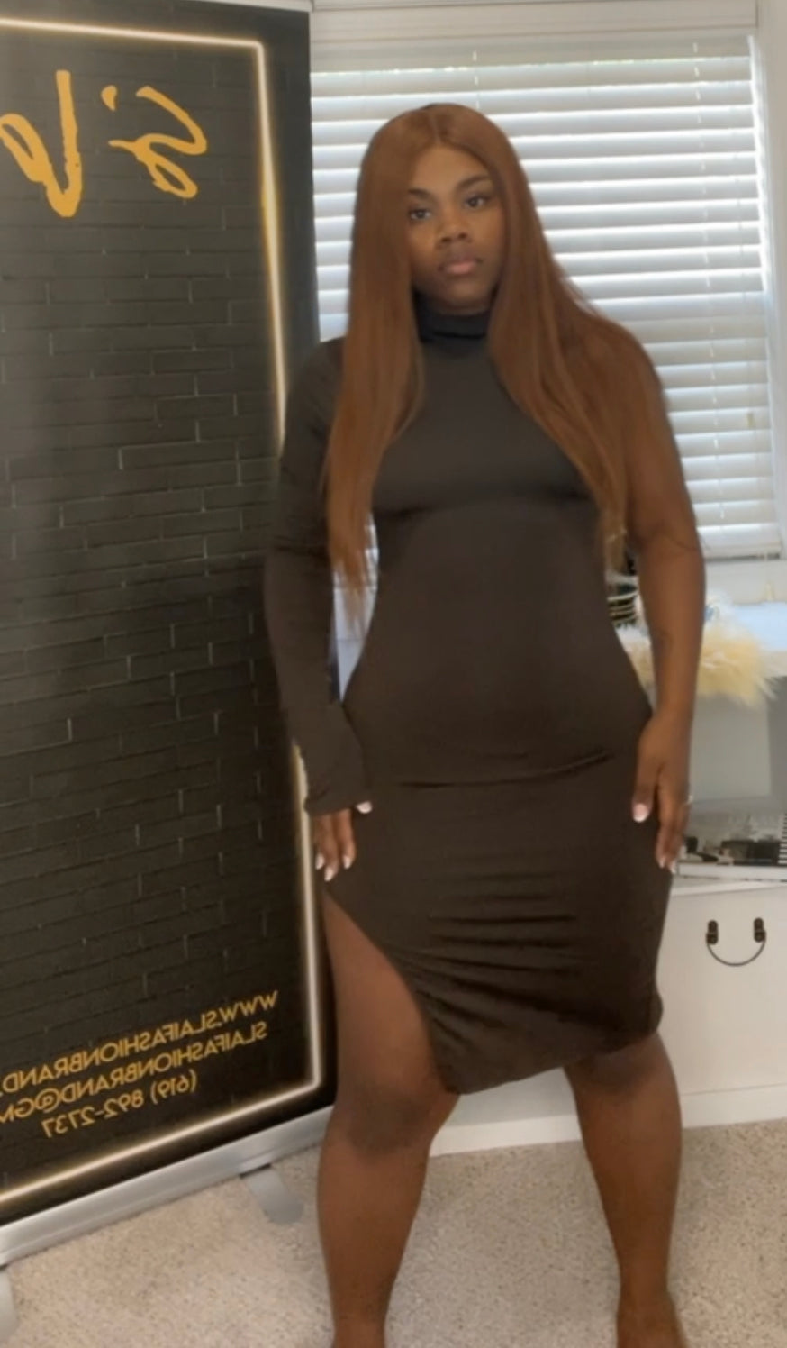 Our Lil Babe is a stunning semi mini dress. One side is cut higher than the other for a lil thigh action. Also features one long sleeve and mini neck coverage to complete the look. The material is thick soft cotton, has great stretch and hugs the body perfectly !